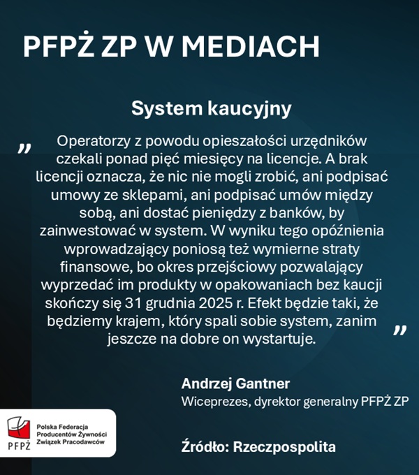 System kaucyjny: komentarz PFPŻ ZP w „Rzeczpospolitej”W najnowszym artykule dziennika „Rzeczpospolita” poświęconym opóźnieniom i niejasnościom wokół wdrażania systemu kaucyjnego w Polsce, głos zabrał Andrzej Gantner, wiceprezes, dyrektor generalny PFPŻ ZP.„Będziemy krajem, który spali sobie system, zanim jeszcze na dobre on wystartuje” – ostrzega Andrzej Gantner, wskazując na brak komunikacji ze strony resortu klimatu, wielomiesięczne opóźnienia w wydawaniu zezwoleń i realne zagrożenia finansowe dla firm wprowadzających produkty na rynek.